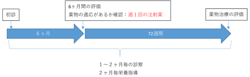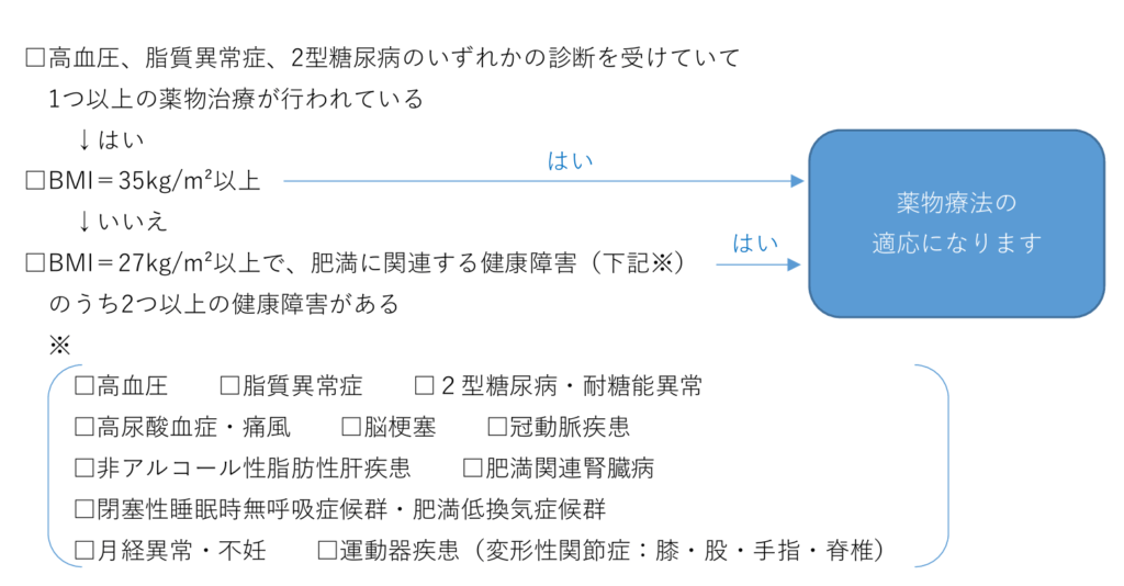 肥満症外来開始から6ヶ月間は、高血圧・脂質異常症・糖尿病に関する治療薬の全部または一部の治療薬を当院で処方する必要があります。